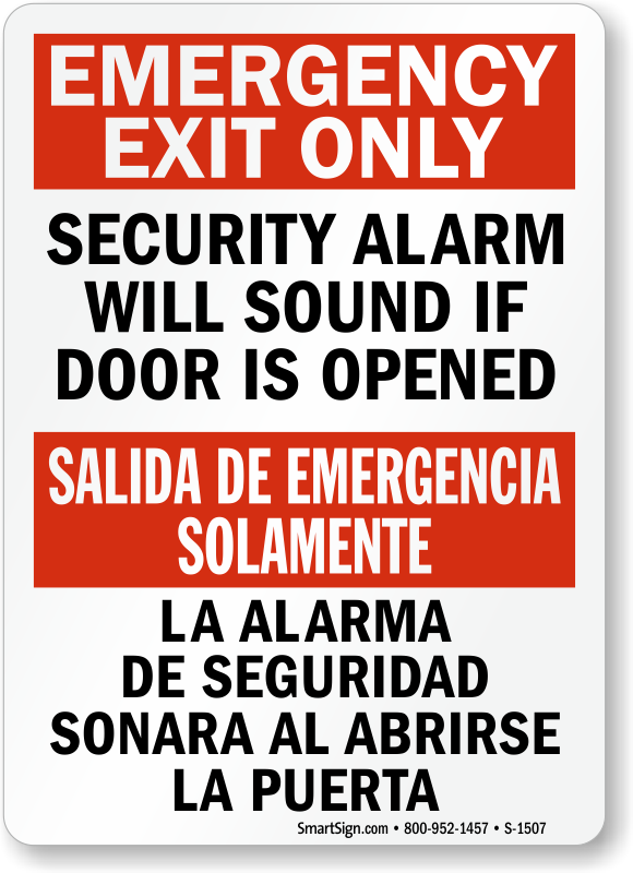 In an emergency, fire safety signs are critically important. Use a "emergency exit only security alarm will sound if door is opened " bilingual sign. Provide critical information.