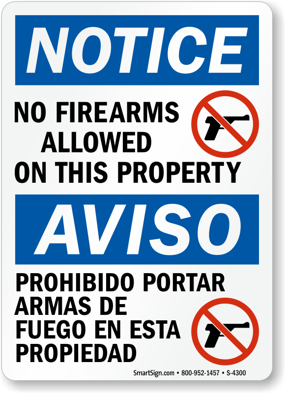 Keep guns, with the hazard they present, out of your facility. Bilingual sign.