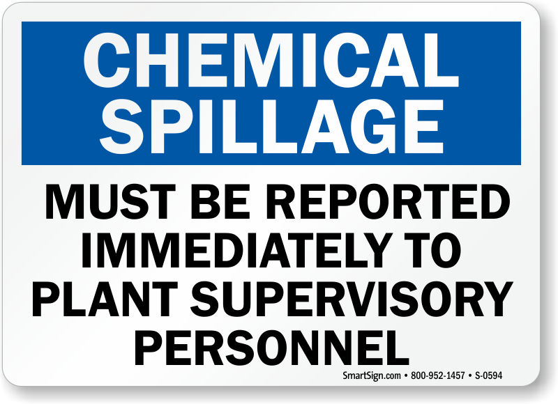 Use a "chemical spillage must be reported immediately to plant supervisory personnel" sign and emphasize safety standards in your workplace.