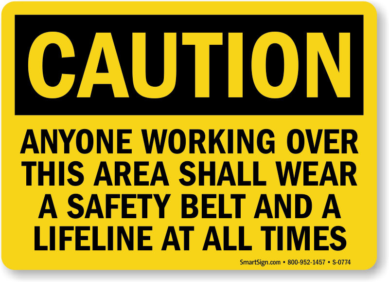 OSHA Caution Sign: Anyone Working Over This Area Shall Wear A Safety Belt and A Lifeline At All Times