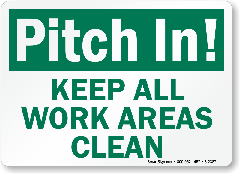 Housekeeping Clean Signs Label: Pitch In! Keep All Work Areas Clean S-2387