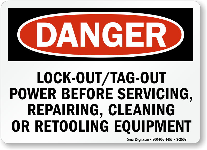 Use a "lock out/tag out power before servicing, repairing, cleaning or retooling equipment" sign. Underline the importance of a safe operation.