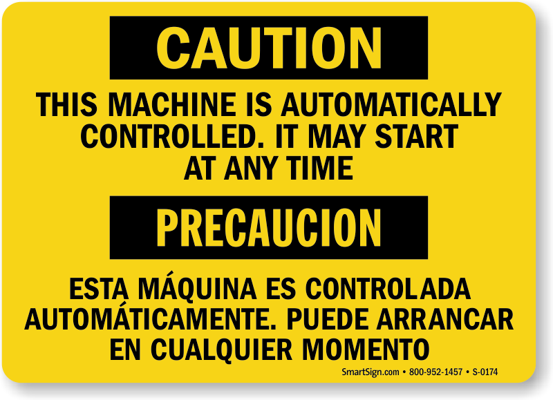 Prevent dangerous accidents. Use a This Machine Is Automatically Controlled. It May Start At Any Time sign to let people know of the potential danger.