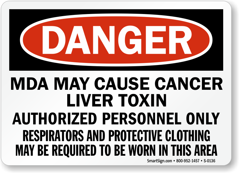Safety sign reads "MDA May Cause Cancer Liver Toxin, Authorized Personnel Only Respirators and Protective Clothing May Be Required To Be Worn In This Area".