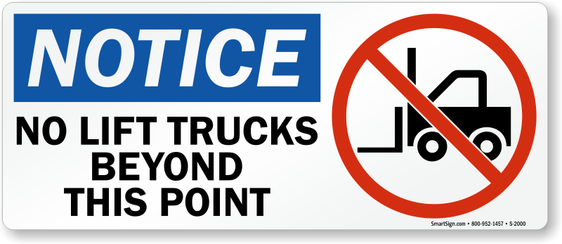 Keep lift trucks out of certain spaces with these notice signs, complete with small lift truck graphic.