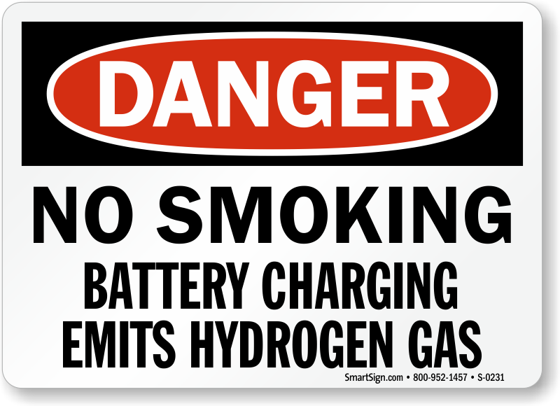 Stop dangerous situations. Use a "no smoking battery charging emits hydrogen gas" sign.