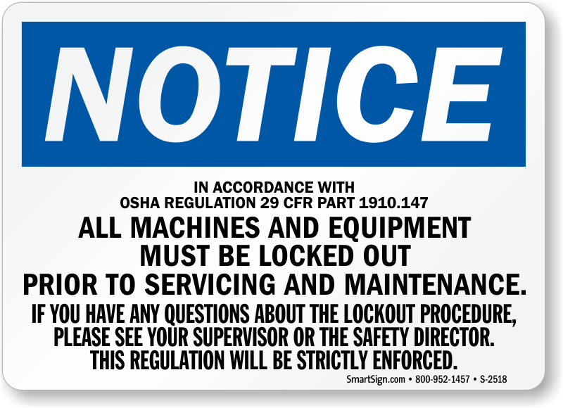 OSHA Notice Sign: In Accordance With OSHA Regulation 29 CFR Part 1910.147 All Machines and Equipment Must Be Locked Out Prior To Servicing and Maintenance. If You Have Any Questions About The Lockout... S-2518