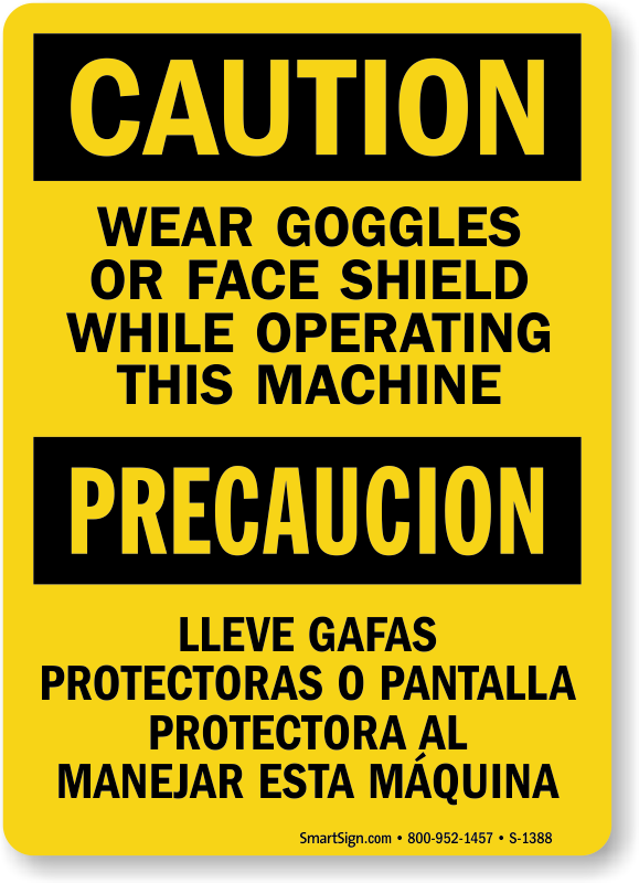 Use a "wear goggles or face shield while operating this machine" bilingual sign.