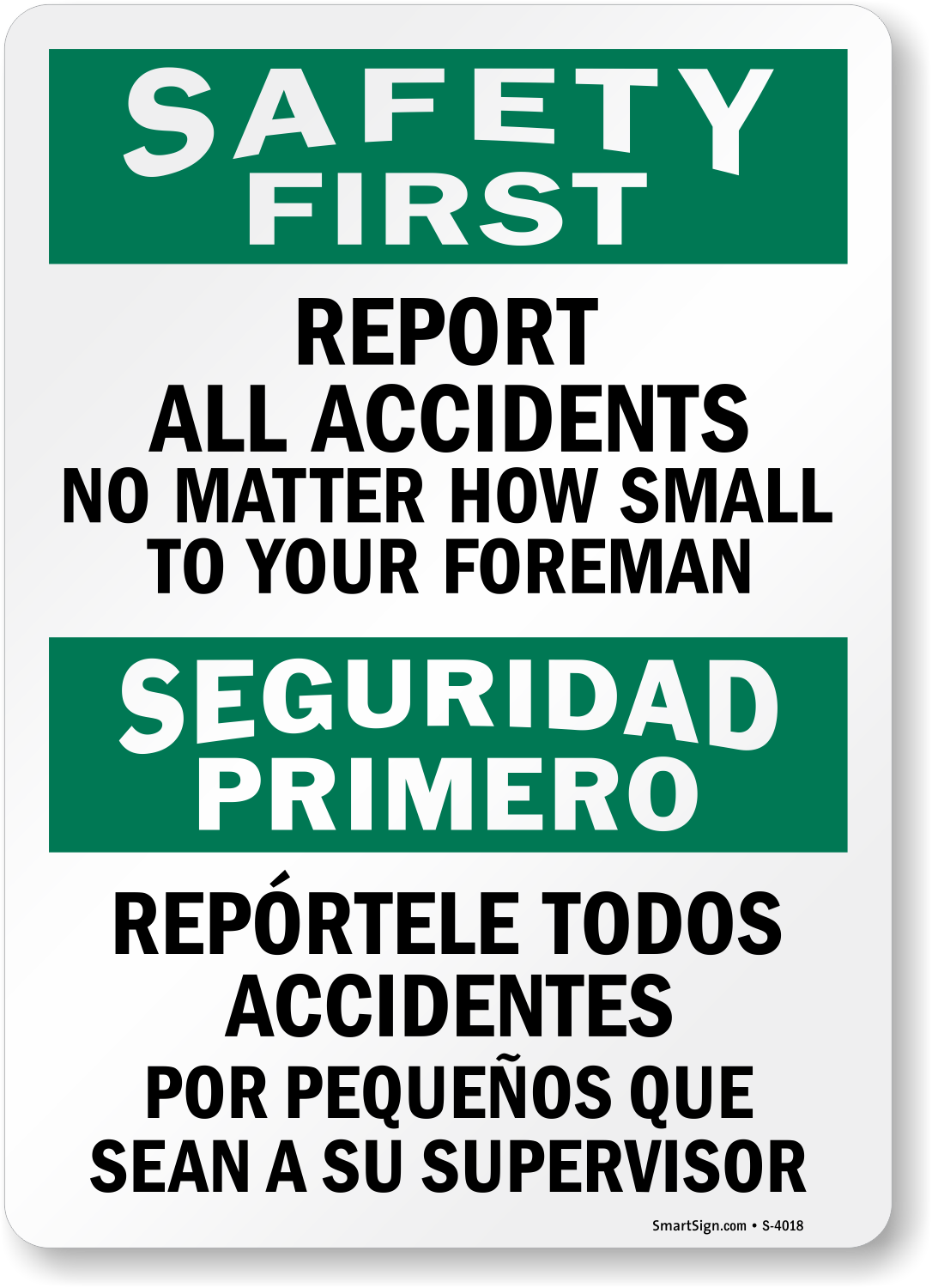 Bilingual OSHA Safety First / Seguridad Primero Sign: Report All Accidents No Matter How Small To Your Foreman
