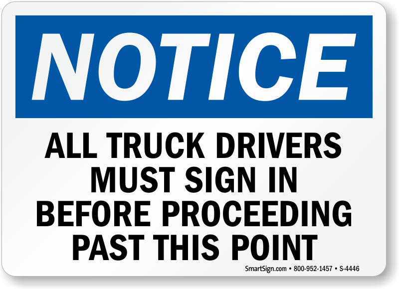 OSHA Notice Sign: All Truck Drivers Must Sign In Before Proceeding Past This Point S-4446 Learn More...