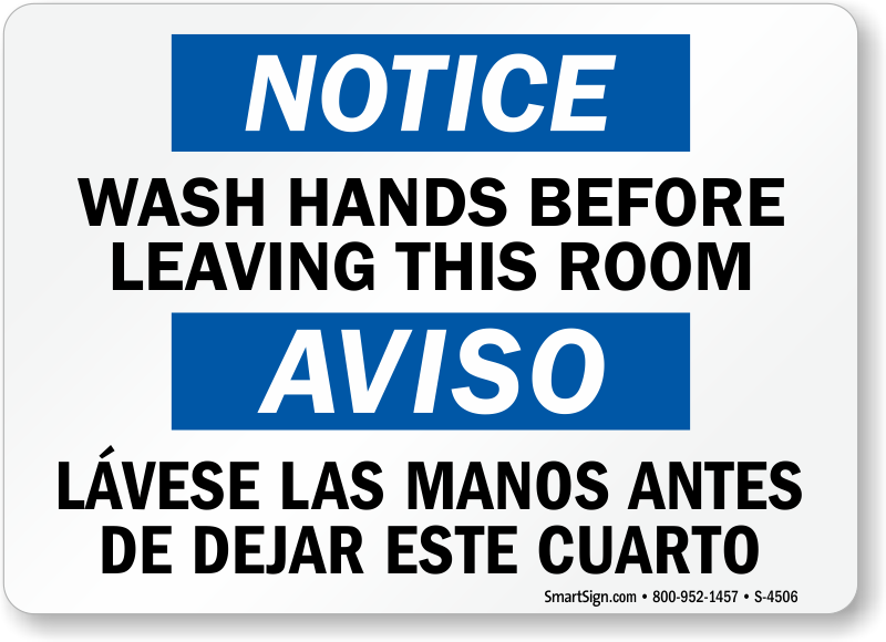 Washing hands regularly is one of the most important ways to reduce contamination. Bilingual language on sign.