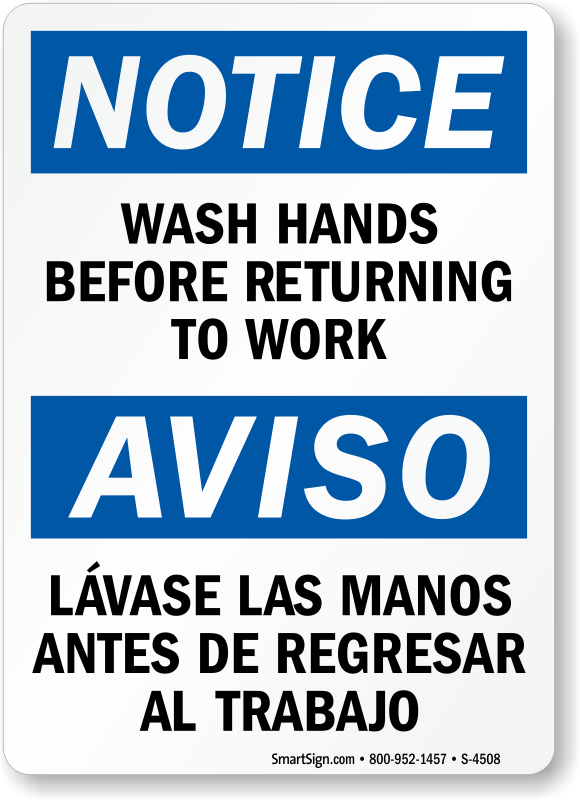 Washing hands regularly is one of the most important ways to reduce contamination. The bilingual language on this sign will help to communicate with a large audience.