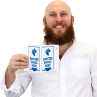 - Sign features a bright blue graphic and text that shows hand sanitizer is here to use.