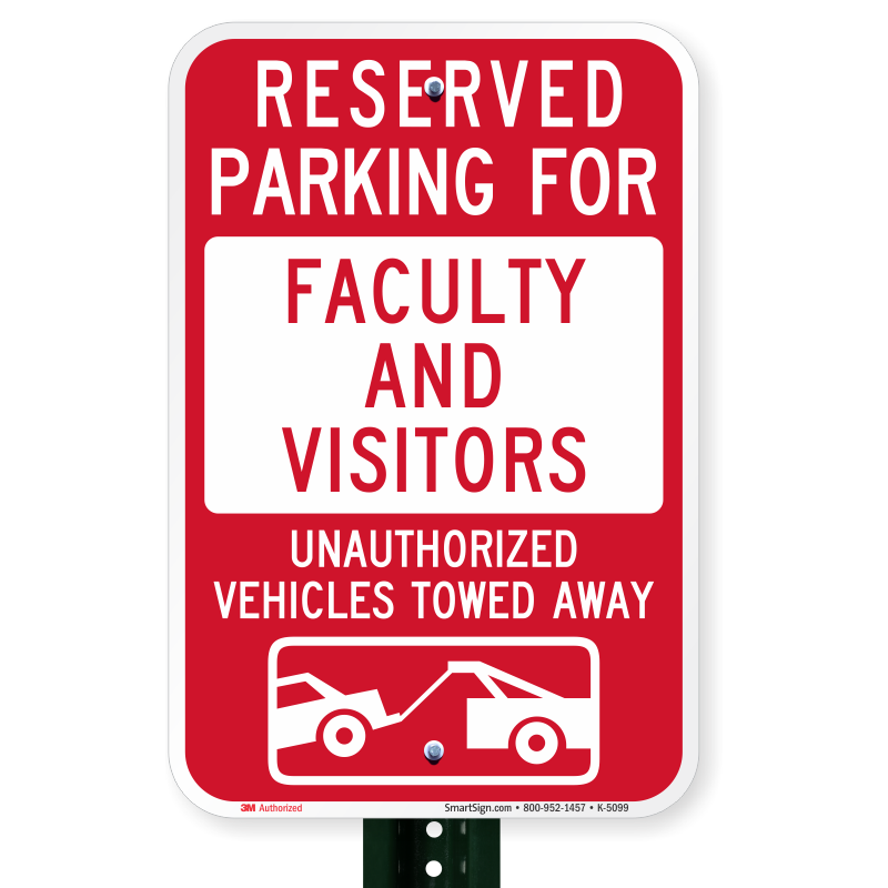 Tow Away Sign: Reserved Parking For Faculty And Visitors : Unauthorized Vehicles Towed Away K-5099 Learn More...