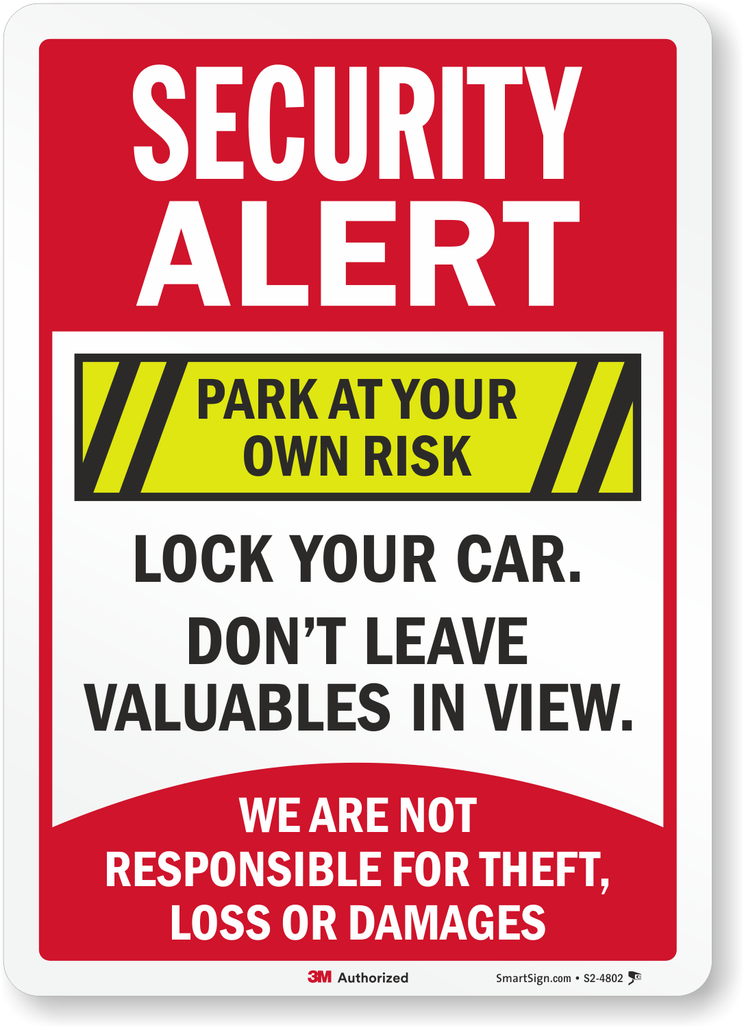Park At Your Own Sign: Security Alert - Lock Your Car, Don't Leave Valuables In View, We Are Not Responsible For Theft, Loss Or Damages S2-4802