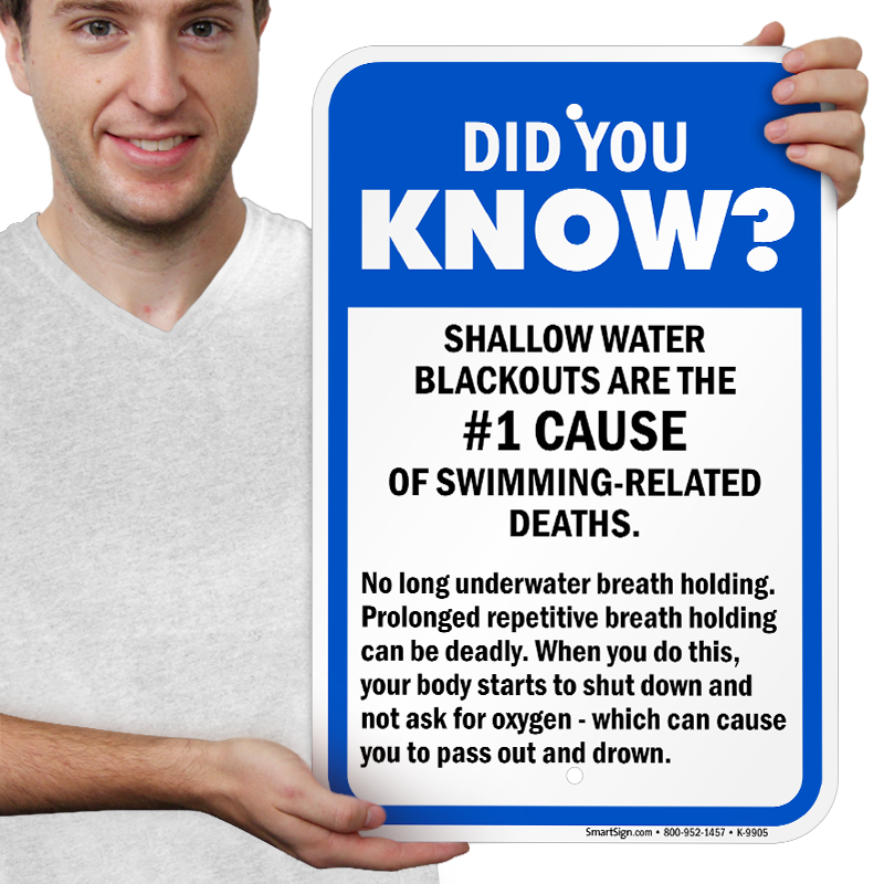 No Breath Holding Sign: Did You Know? Shallow Water Blackouts are the #1 Cause of Swimming-Related Deaths. K-9905 Learn More...