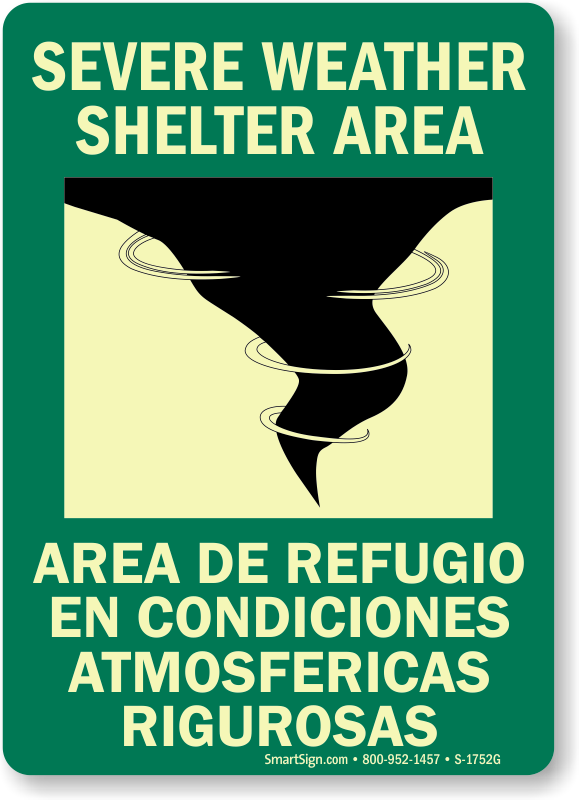 In a fire, time is of the essence. Use a "severe weather shelter area (with graphic) (bilingual)" sign. Signs are proven to make a difference.