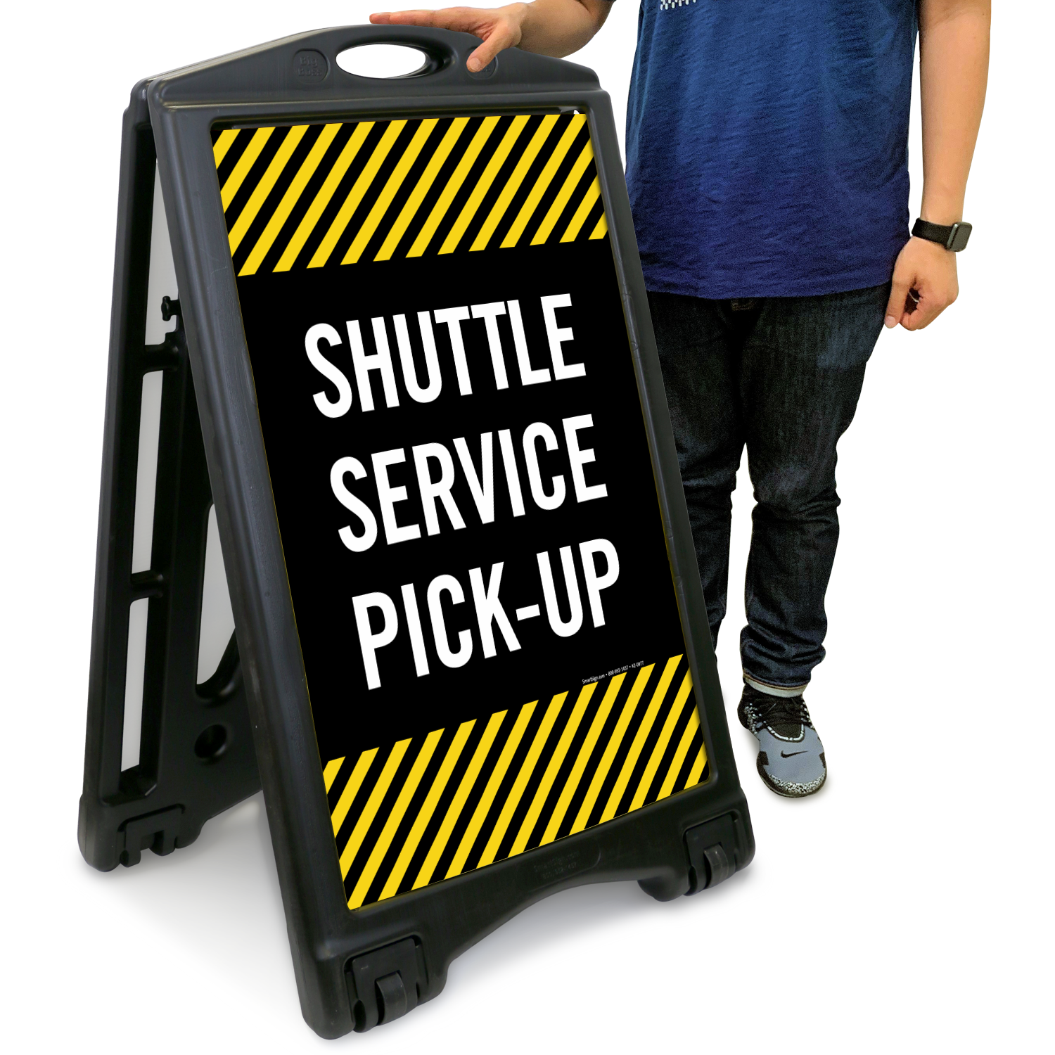 Direct people toward the shuttle service pick-up at your facility. Use this portable light weight A-frame sidewalk sign to display your message.