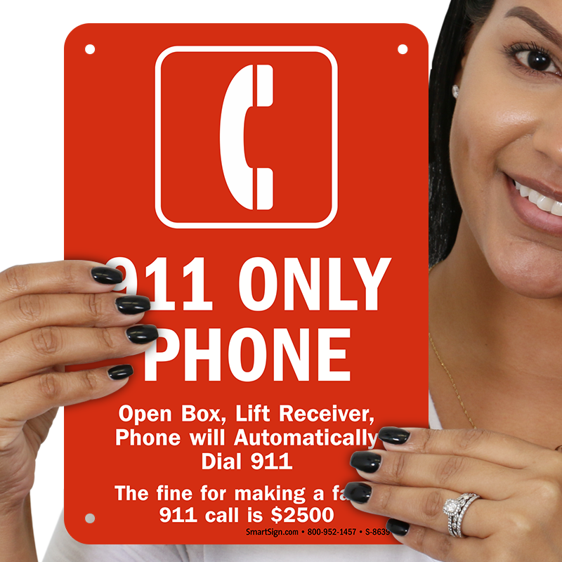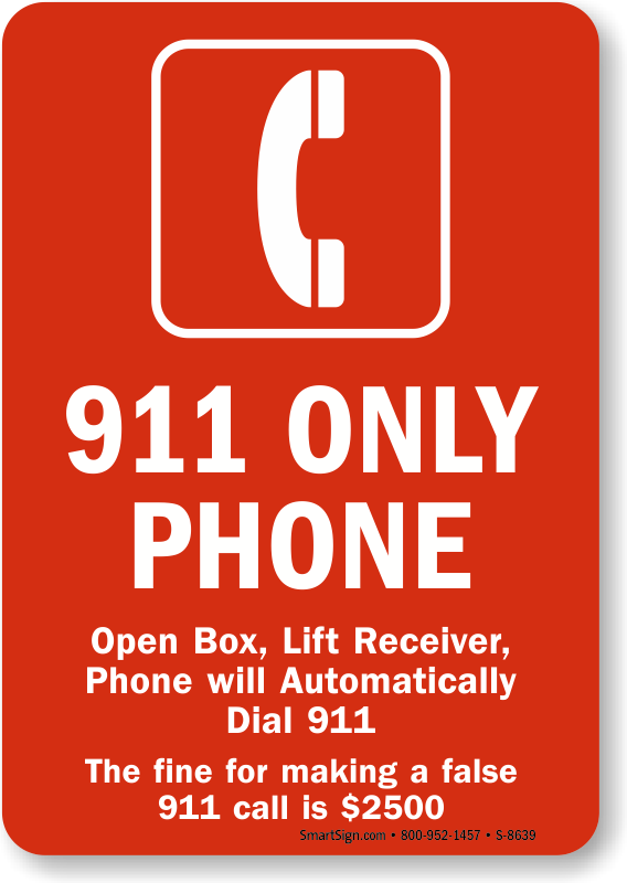 Dial 911 Sign: 911 Only Phone, Open Box Lift Receiver, Phone Will Automatically Dial 911, Fine For False 911 Call Is $2500 S-8639