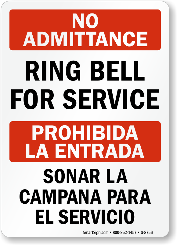 Bilingual No Admittance Sign: Ring Bell For Service, Prohibida La Entrada - Sonar La Campana Para El Servicio S-8756