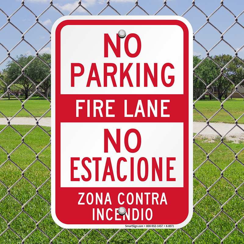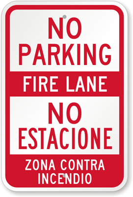 Bilingual Parking Prohibited Sign: No Parking. Fire Lane. No Estacione Zona Contra Incendio K-8971 Learn More...
