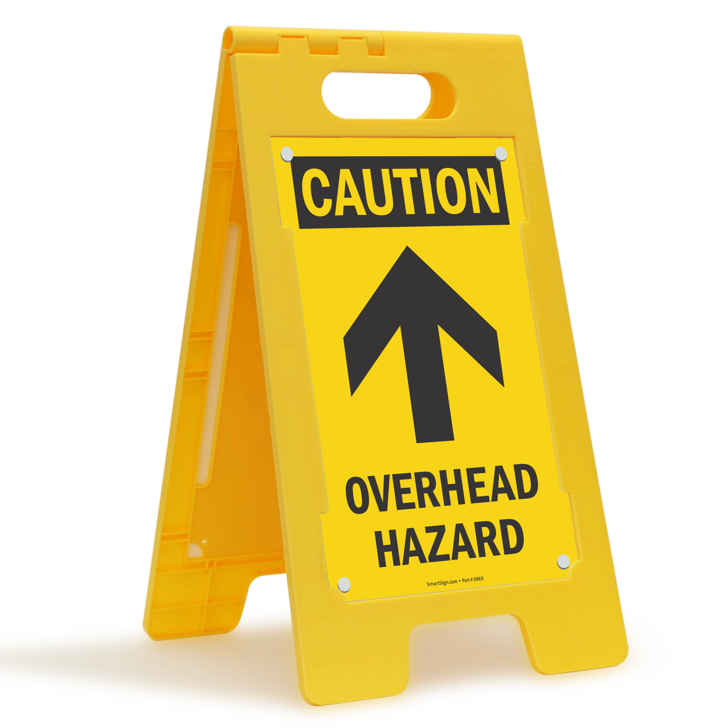 Caution everyone against overhead hazard with a high impact Free-Standing Floor Sign. A bold arrow accompanies the simple message printed on both sides and increases visibility, even from afar. This product outlasts corrugated or flat folding signs, and can be easily moved from one place to another.