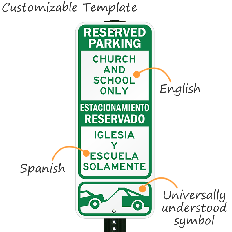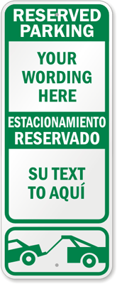 Custom Bilingual Parking Sign: Reserved Parking [Your Wording Here], Estacionamiento Reservado [Su Text To Aqui], (with Tow Graphic)