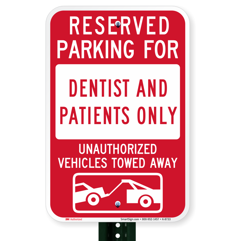 Reserved Parking Sign: Reserved Parking For Dentist And Patients Only, Unauthorized Vehicles Towed Away (with Car Tow Graphic) K-8733 Learn More...