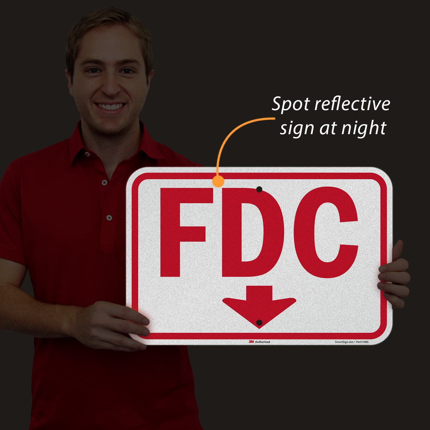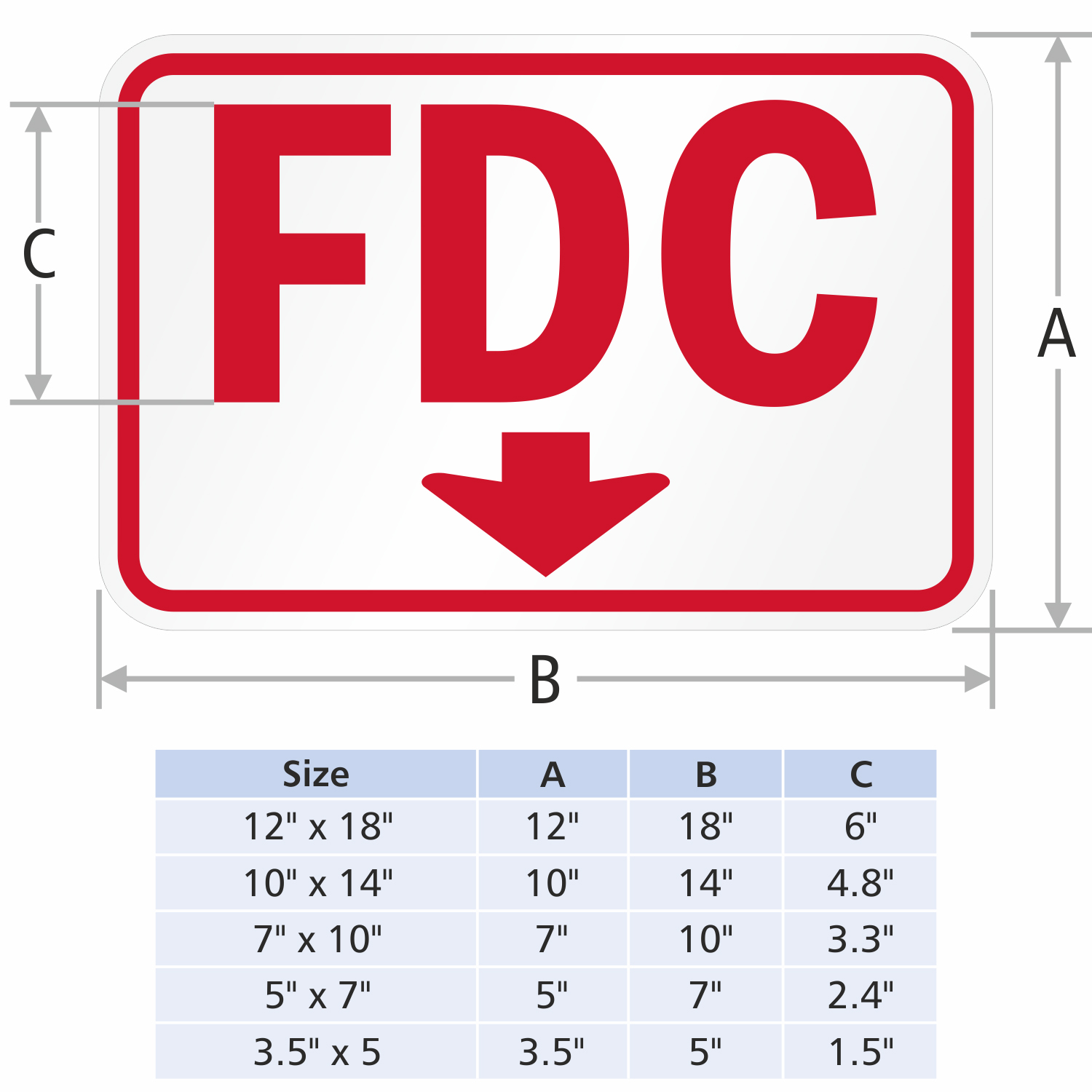 • 12" x 18" size sign features FDC in 6" letter height to comply with IBC regulation.