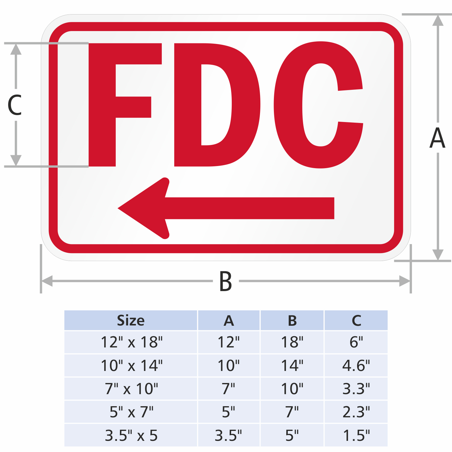 - 12" x 18" size sign features FDC in 6" letter height to comply with IBC regulation.
