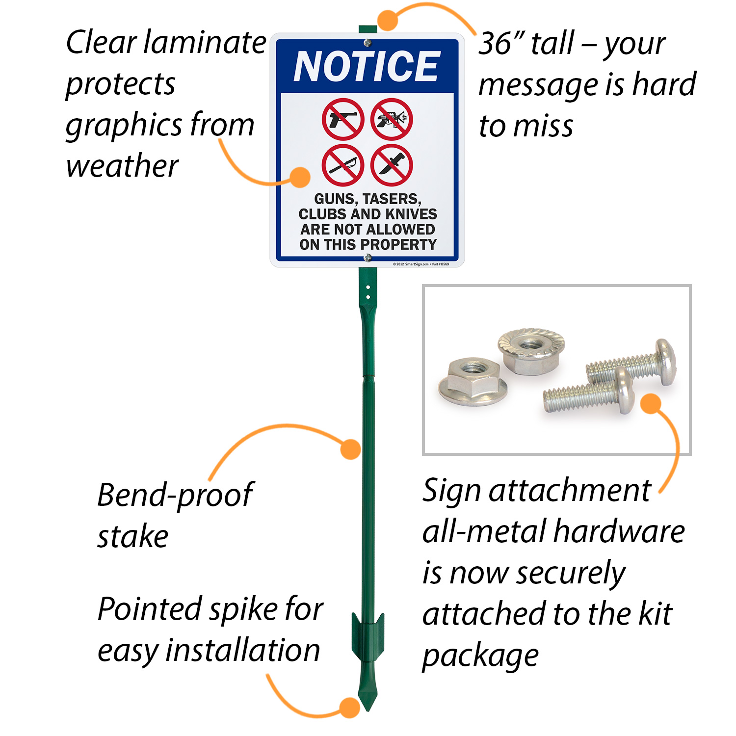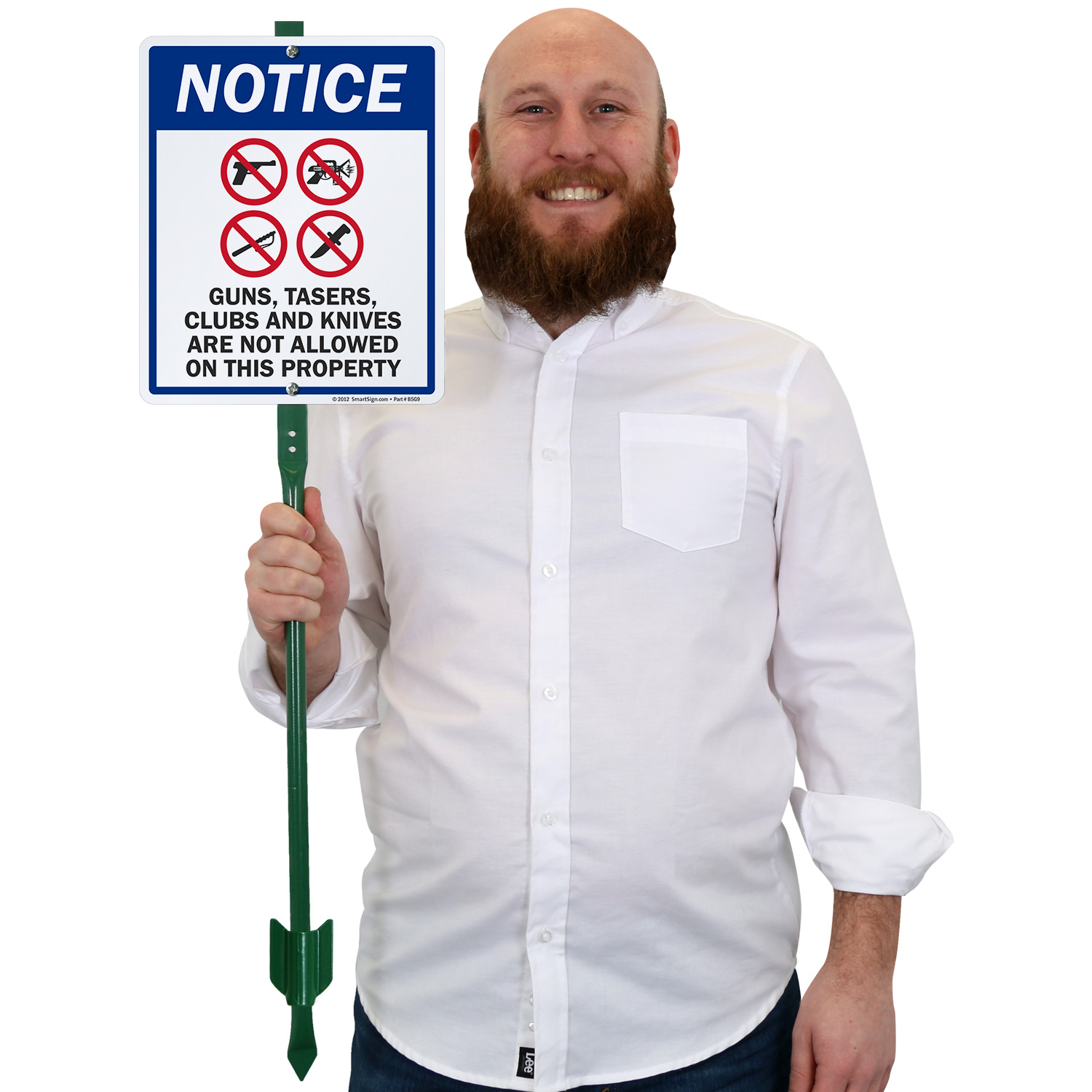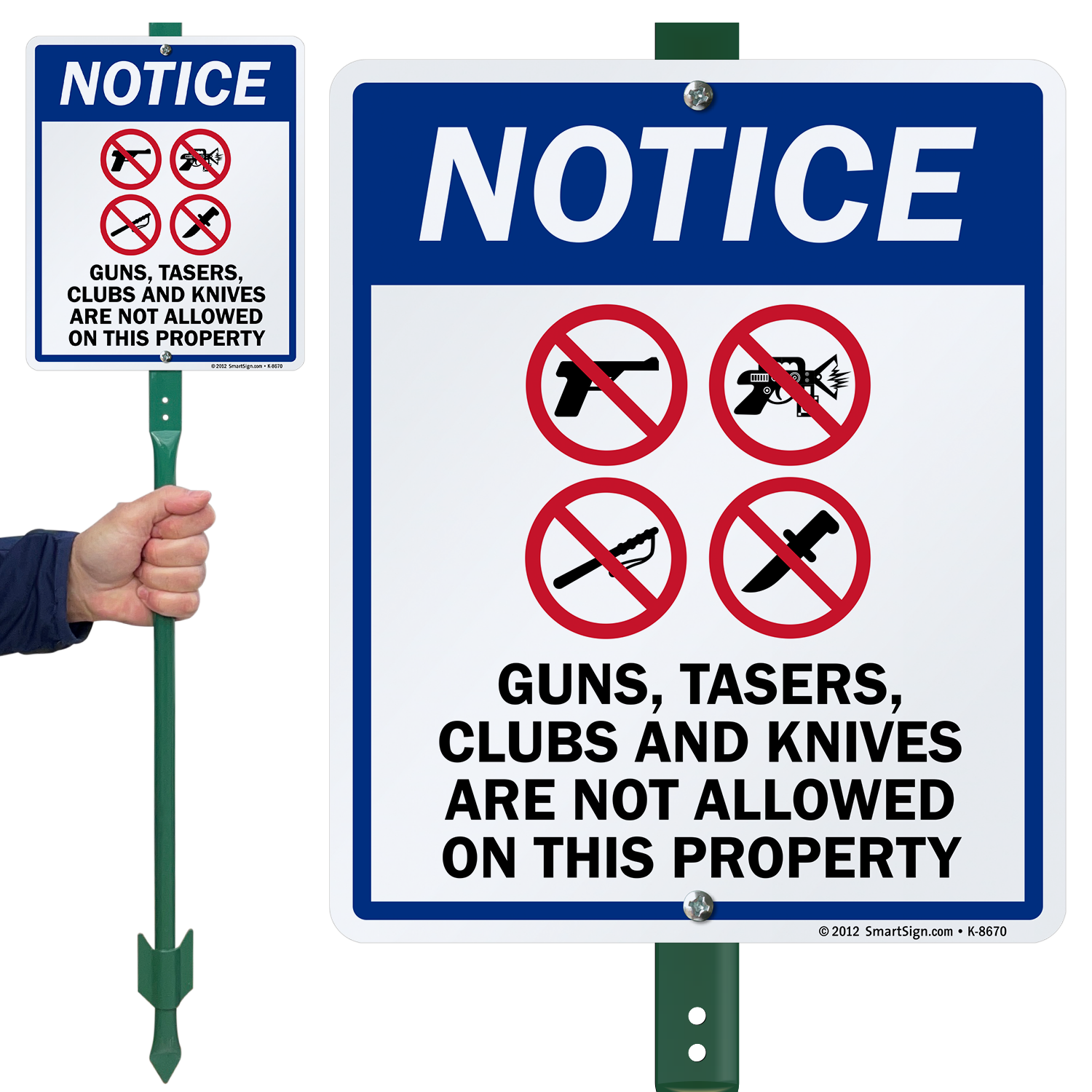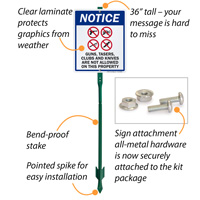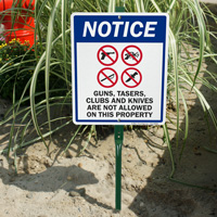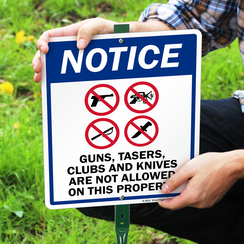 Criminals and weapon bearers take notice! This sign esnures that Guns, Tasers, Clubs, and Knives are not allowed on your property.