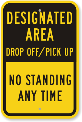 Drop Off/Pick Up Area Sign: Designated Area Drop Off/Pick Up - No Standing Any Time K-8458 Learn More...