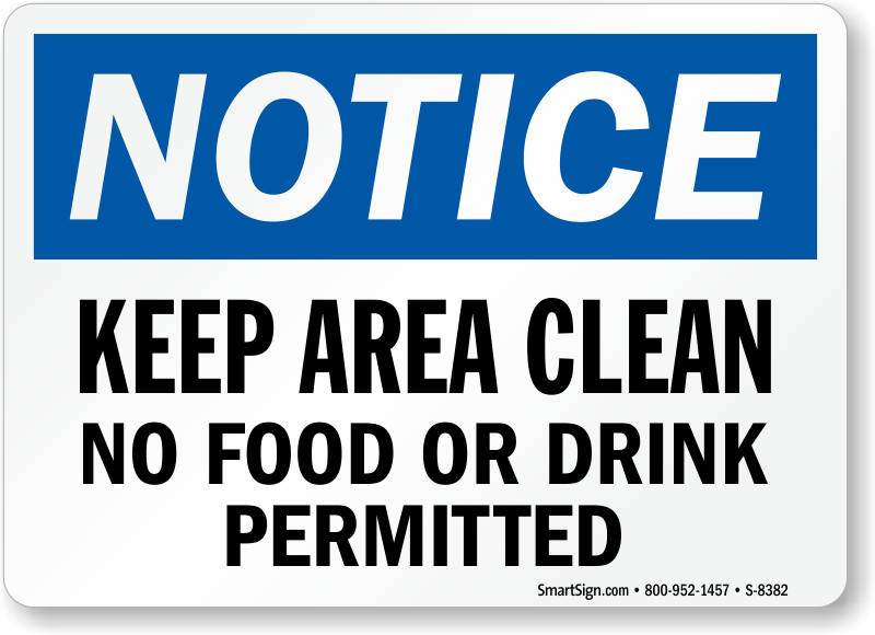 OSHA Notice Sign: Keep Area Clean - No Food Or Drink Permitted S-8382