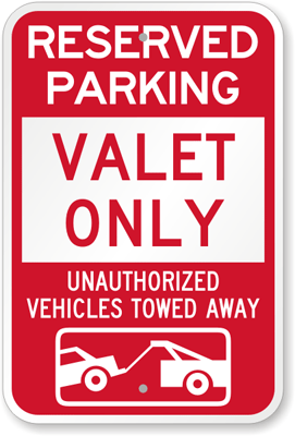 Keep out self-parkers with the threat of towing. Establish valet parking areas with this sign.