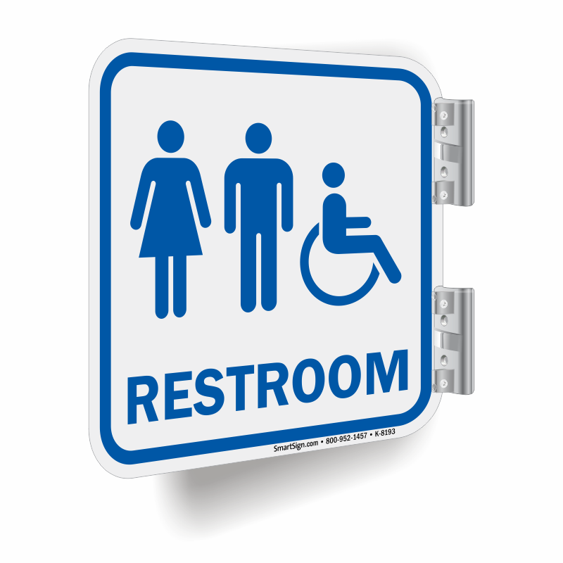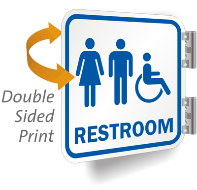 This all encompassing Unisex and Handicap Restroom sign will universally communicate your message. This projecting, double sided sign will point everyone in the right direction. This sign is used by 100's of gas stations for a durable way to mark the outward facing restroom facilities.