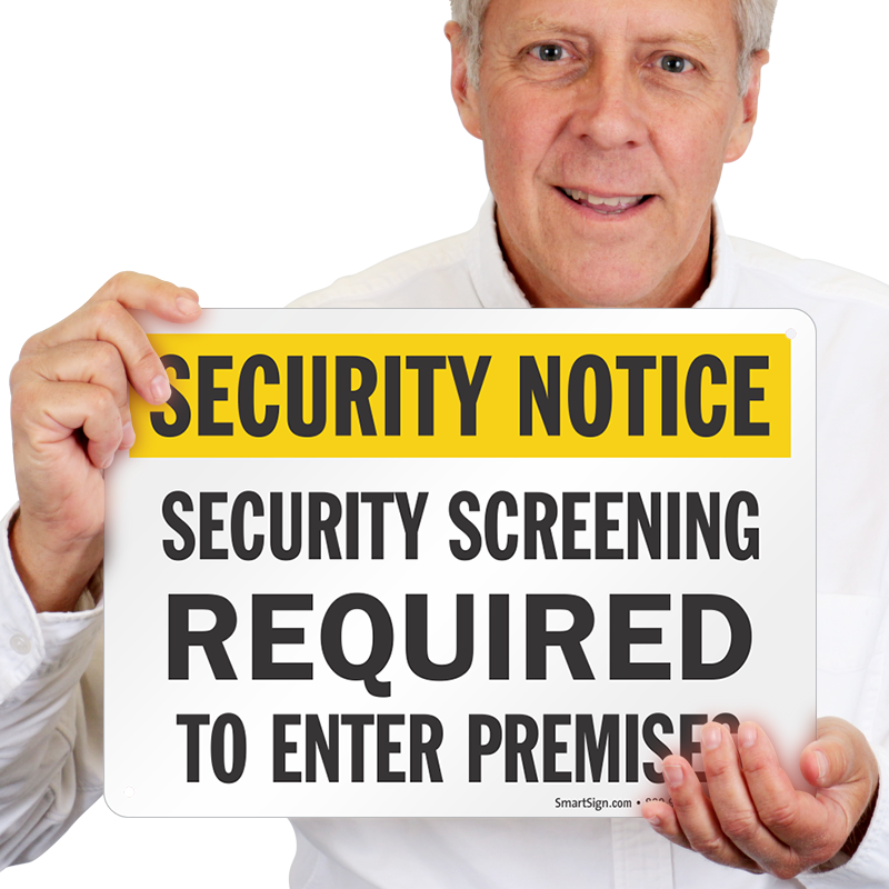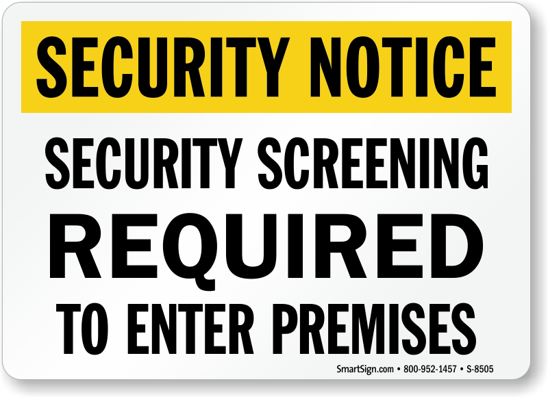 Establish the most intense and efficient security on your property by screening everyone. Direct them to security screening with a Security Screening Required To Enter Premises Security Notice Sign.