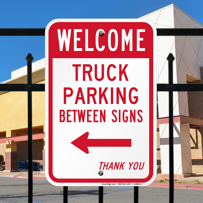 Reserved Parking Sign: Welcome: Truck Parking Between Signs (with Left Arrow) Thank You Learn More...