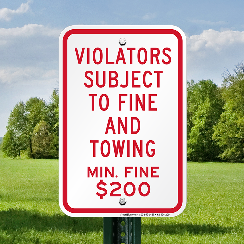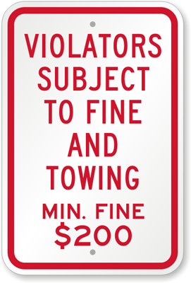 Tow-Away Sign: Violators Subject To Fine And Towing Min. Fine $ 200 K-8426-200 Learn More...