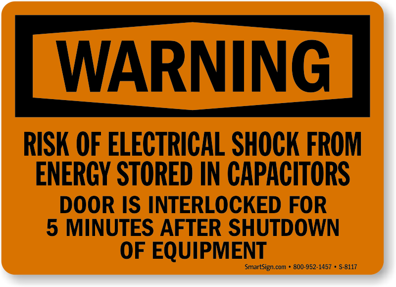 OSHA Warning Sign: Risk Of Electrical Shock From Energy Stored In Capacitors, Door Is Interlocked For 5 Minutes After Shutdown Of Equipment S-8117