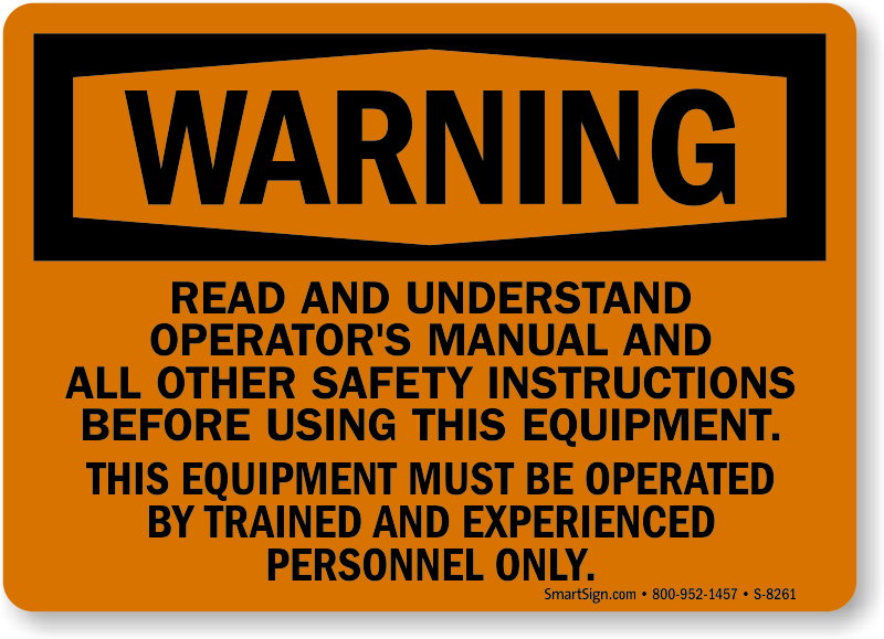 This safety sign will guarantee that all operators of this equipment practice safe machinery procedures. An Operator's Manual Sign enforces the rules!