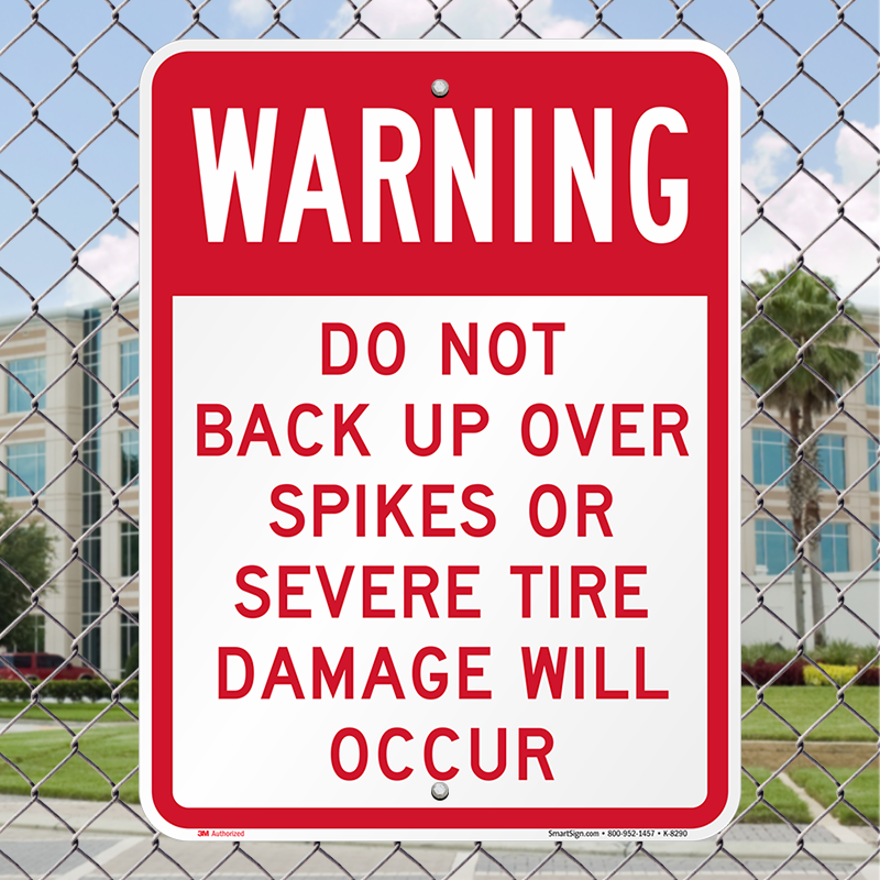 Warning Sign: Warning: Do Not Back Up Over Spikes Or Severe Tire Damage Will Occur