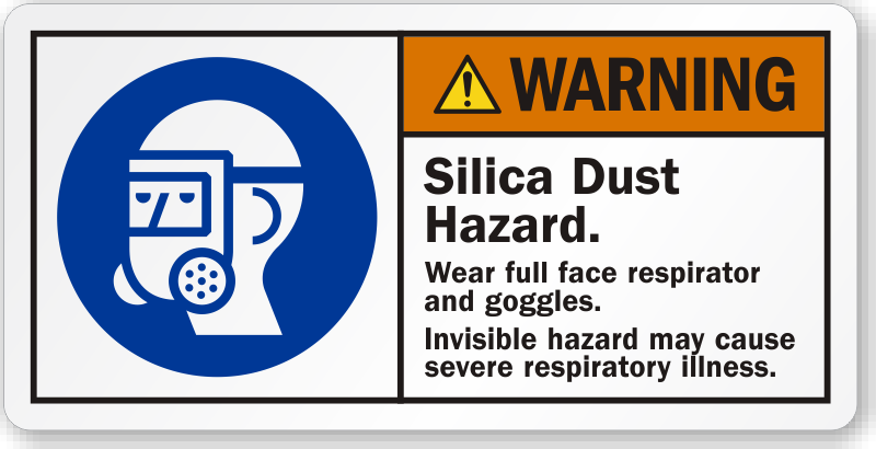 Indicate the areas in your facility that have silica dust hazard. Mark them by applying this label and instruct workers to wear PPE in order to avoid respiratory illness.