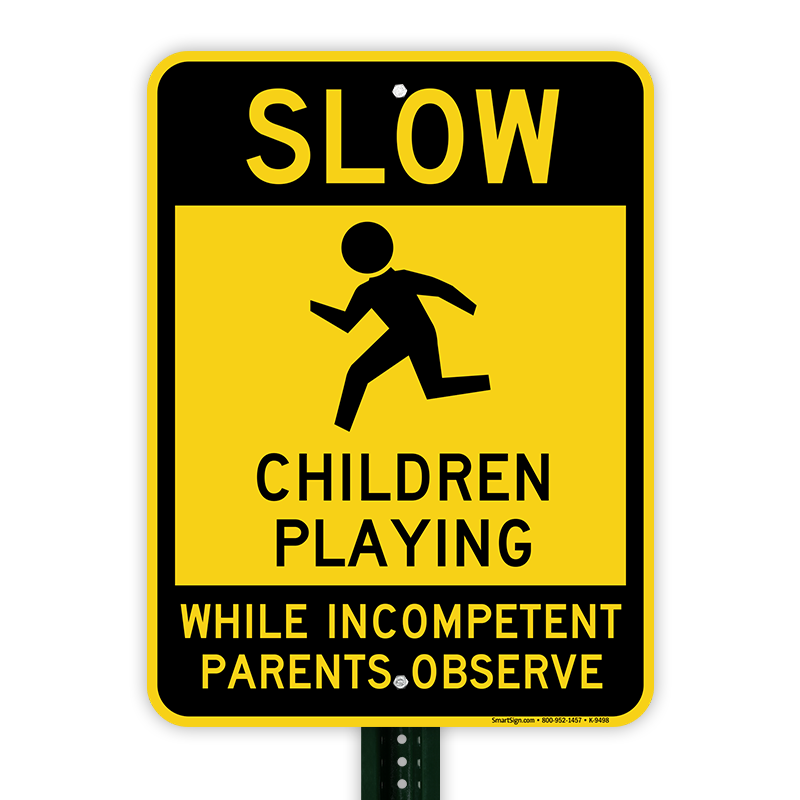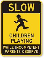 Funny Kids At Play Sign: Slow Children Playing While Incompetent Parents Observe (With Kid Running Graphic) K-9498 Learn More...