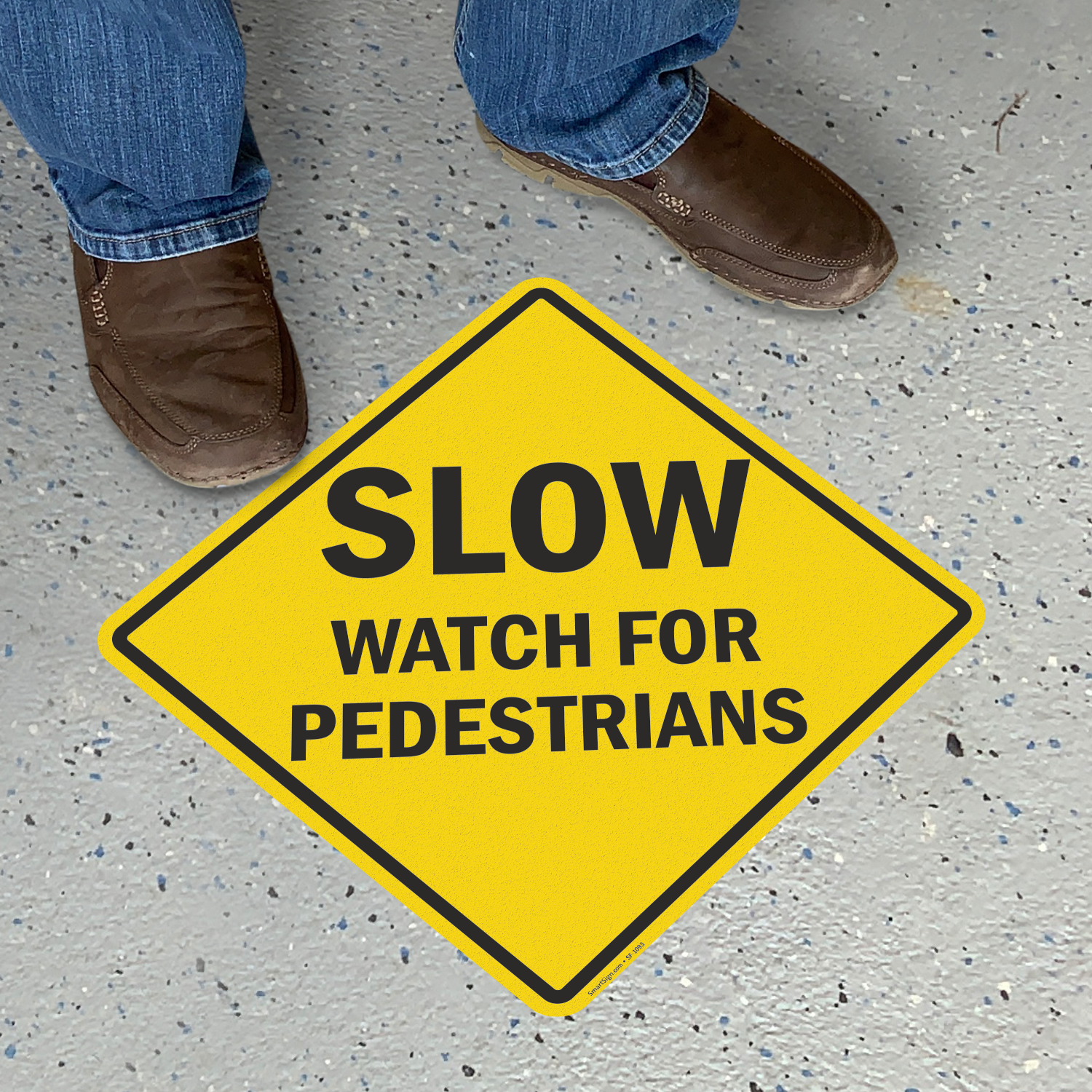 Alert motorists about the presence of pedestrians and have them slow down with this conspicuous floor sign. Go for the reflective option for high visibility even in the dark.