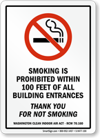 This 'Smoking Is Prohibited Within 100 Feet Of All Building Entrances' sign helps you comply with Washington Clean Indoor Air Act - RCW 70,160.