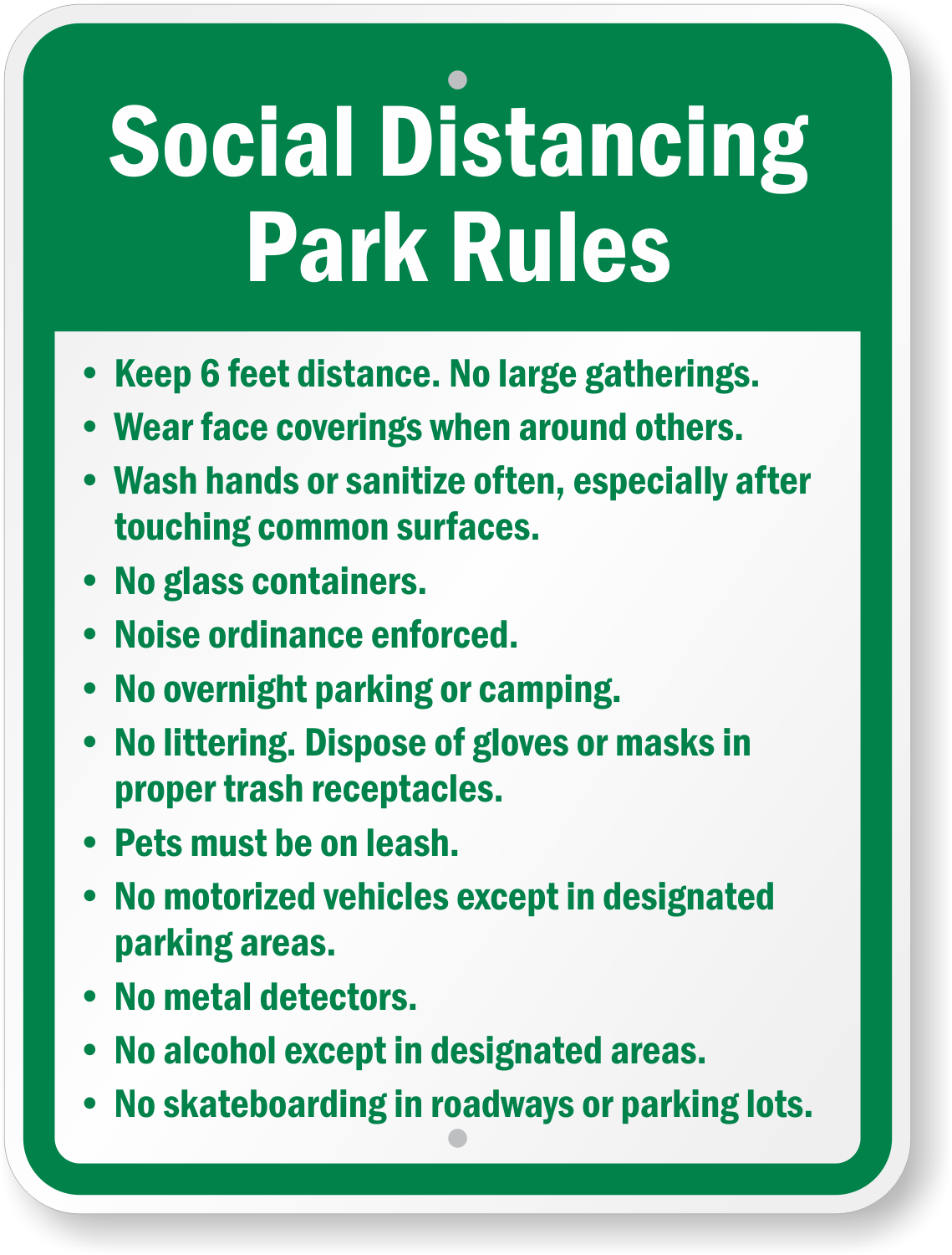 Keep park users informed that metal detectors, alcohol, skateboarding, motorized vehicles, littering, camping, overnight parking, glass, etc. are not allowed but washing/sanitizing hands, wearing face covering, keeping 6 feet distance and other social distancing rules are necessary.