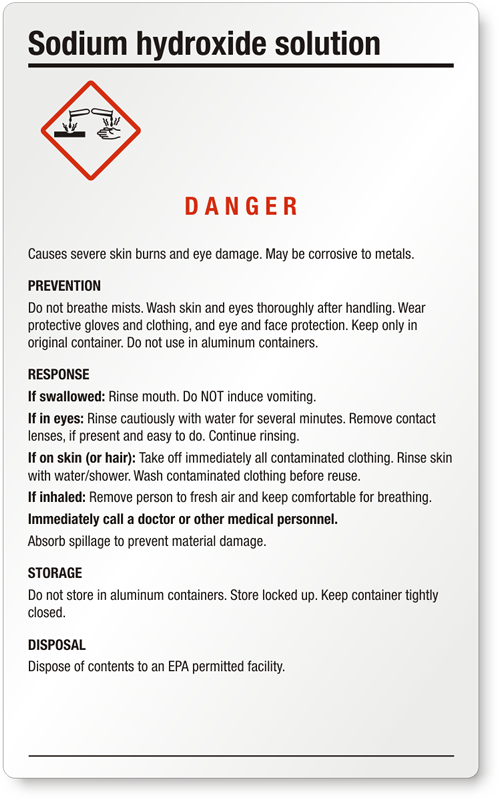 Drops of Sodium Hydroxide Solution can decompose proteins and lipids in skin, eyes, and tissues. Warn everyone in your facility against Sodium Hydroxide hazards with this GHS Label.