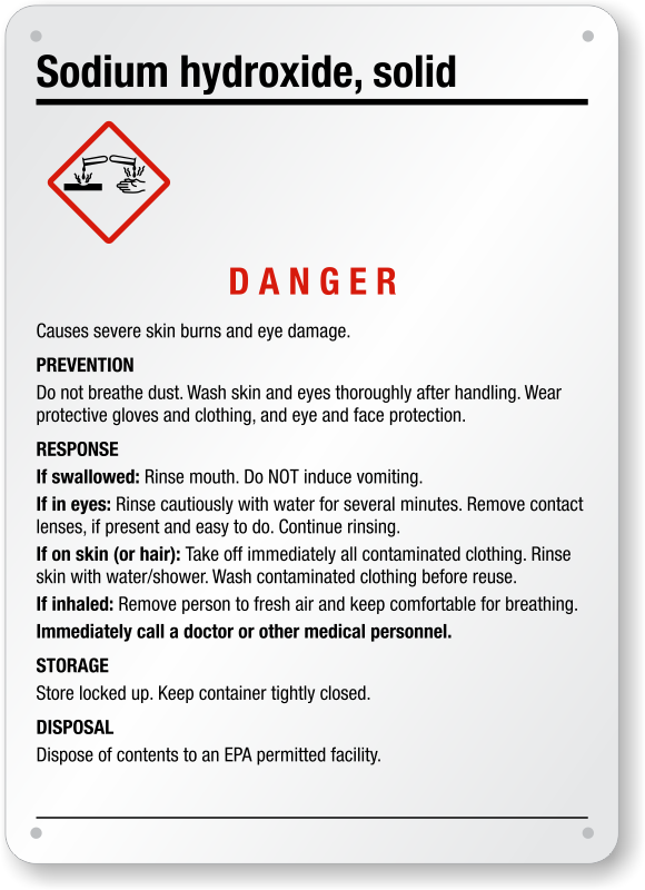Sodium Hydroxide aka caustic soda is highly corrosive. Warn your workers against this chemical using Sodium Hydroxide (Solid) GHS Sign and ensure safe handling.