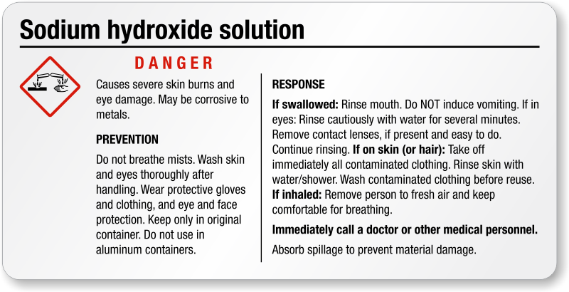 Drops of Sodium Hydroxide Solution can decompose proteins and lipids in skin, eyes, and tissues. Warn everyone in your facility against Sodium Hydroxide hazards with this small GHS Label.