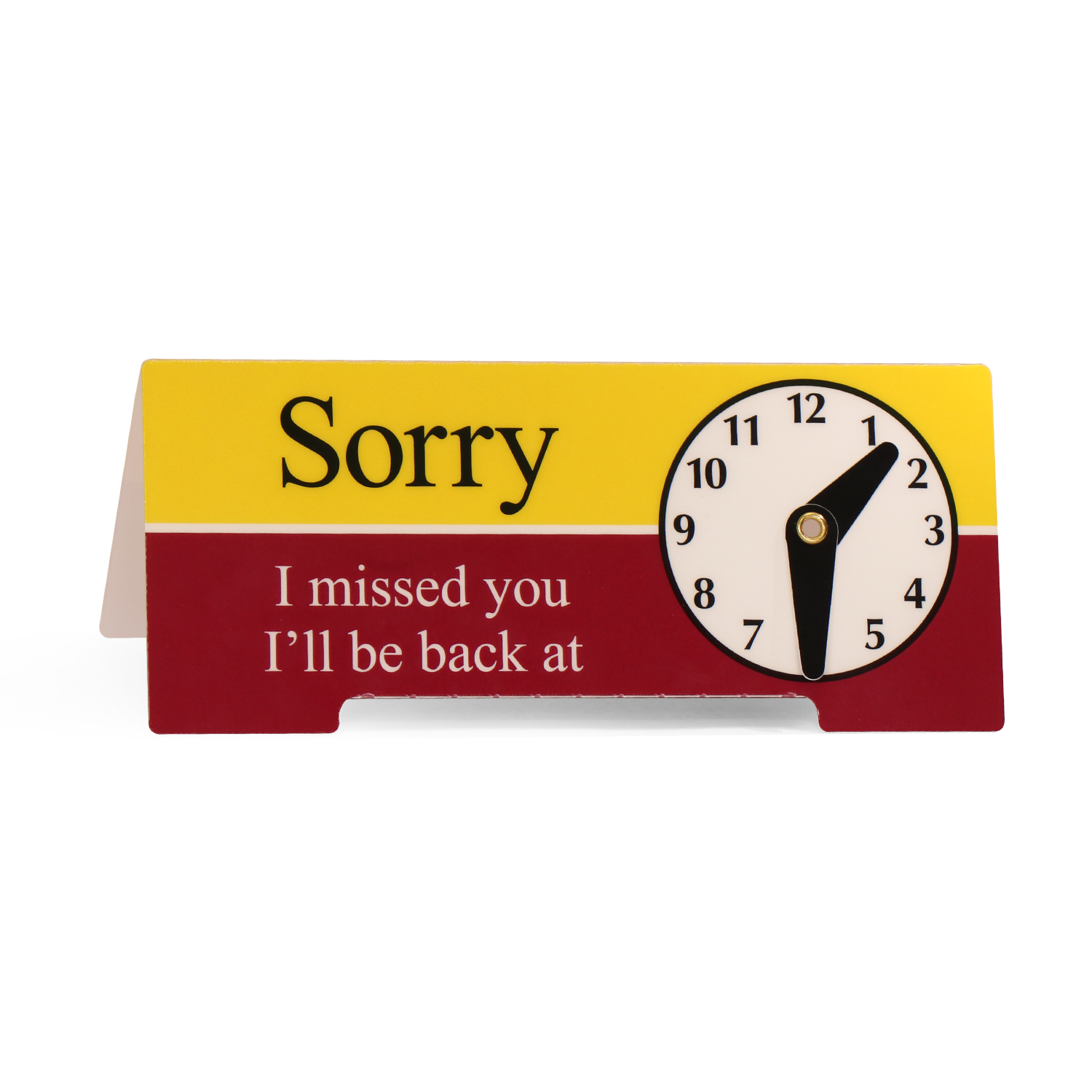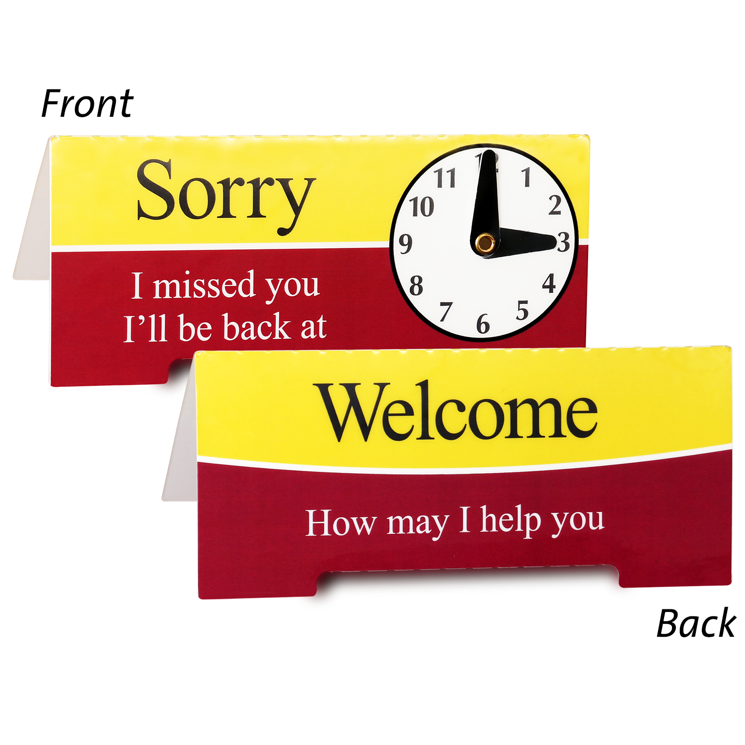 Use this double-sided Be Back sign to show return time and display a welcome message when available.